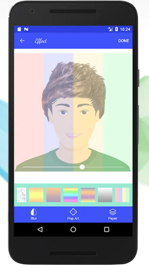 - Apply different effects (blur, pop art styles, paper styles).