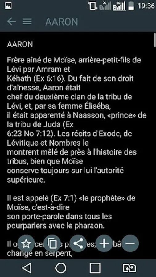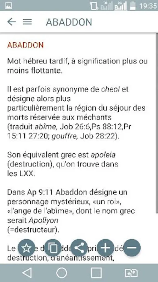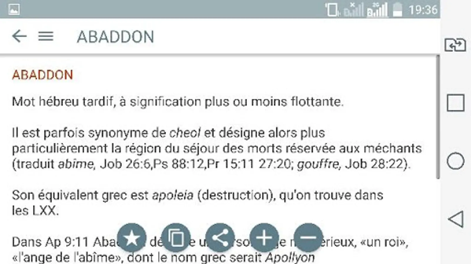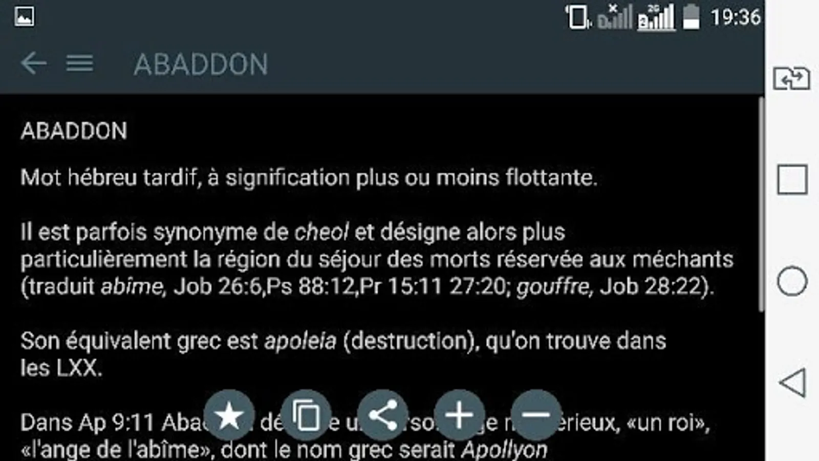 You can add to favorites most interested biblical terms. You can also copy text, share via Facebook, SMS and so on.