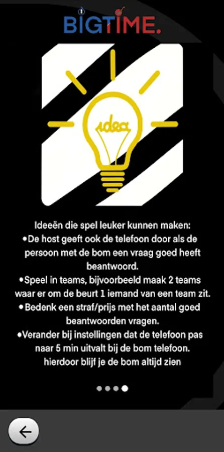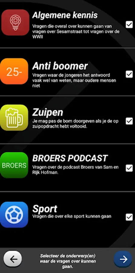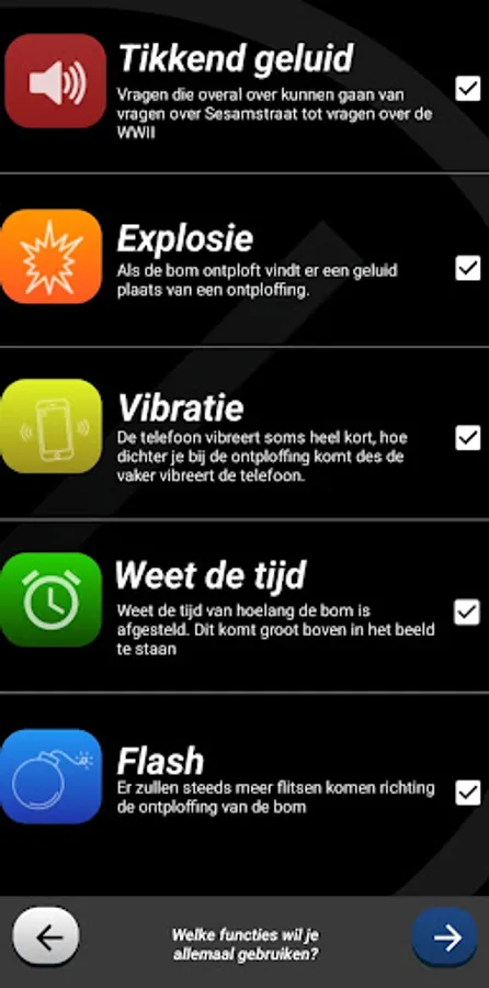 In the app you can choose the function of the bomb, for example the vibration, sound and flashes of the bomb. You can also choose the themes of the questions yourself, for example sports, drinking or youth.