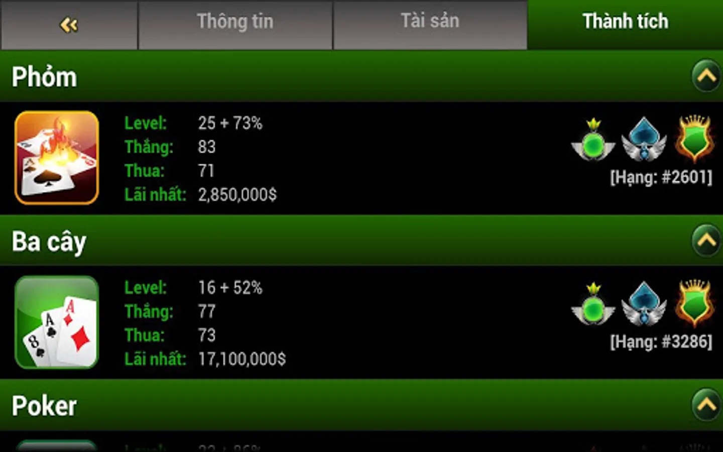 Excellent medal system with many levels makes it easy to distinguish the level of gamers. In addition, the ranking of each player in each game is very rich, detailed and impressive.