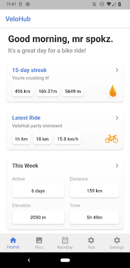 VeloHub allows you to sync your rides from services such as Strava, tracks daily streaks, calculates a performance score for each ride, and much more.