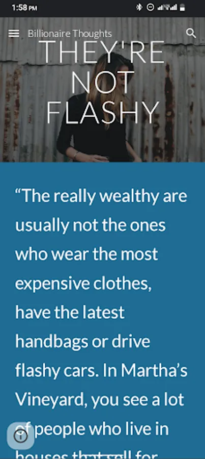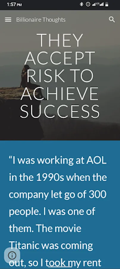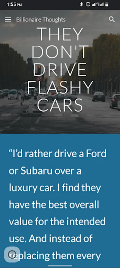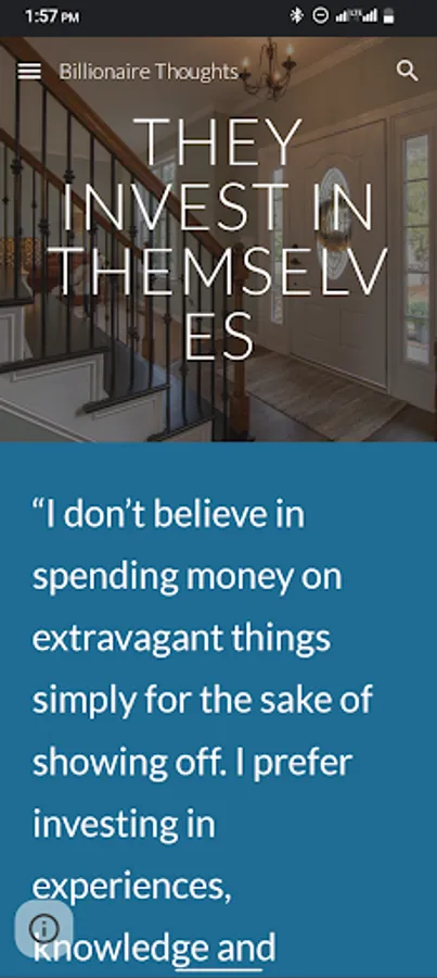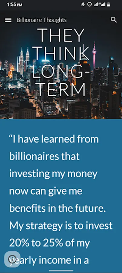 Introducing the Billionaire Thoughts app, designed to help individuals develop the mindset of successful entrepreneurs and billionaires. Get motivation and inspiration from some of the world's most successful and wealthy individuals, including Elon Musk on Twitter, Mark Zuckerberg on Facebook, Instagram, and WhatsApp, Bill Gates on Microsoft, Jeff Bezos on Amazon, Steve Jobs and Apple, and the founders of Uber, TikTok, Spotify, Airbnb, Snapchat, Pinterest, Telegram, YouTube, and Google.