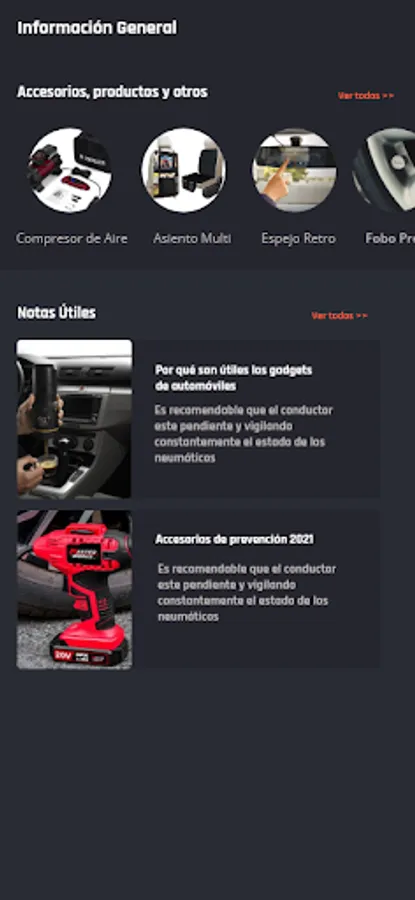 Think of our app as the first option since it allows you to have the most up-to-date information on accessories for cars from gadgets, prevention articles, lights, decoration, among others ...