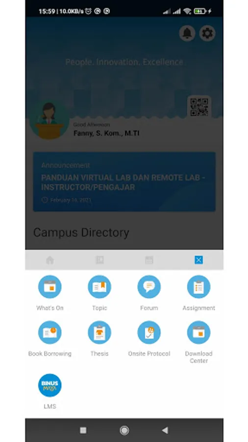 BINUS Mobile for Lecturer is simply an all in one mobile app that will enhance lecture experience in Bina Nusantara by providing easier information access. By utilizing BINUS University Mobile for Lecturer, Binusian will be able to access relevant information for their activity in Bina Nusantara.