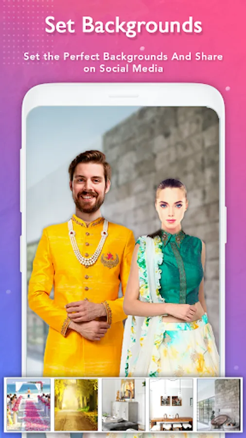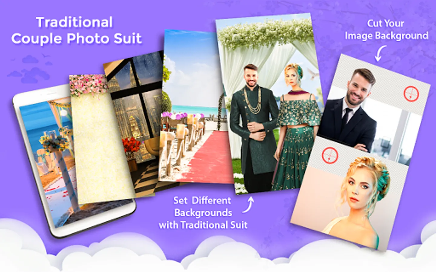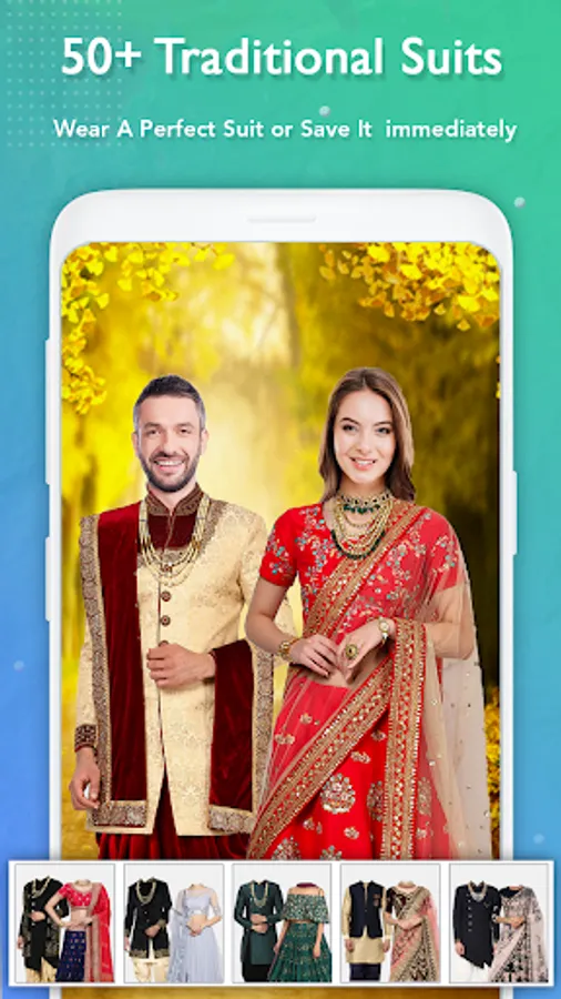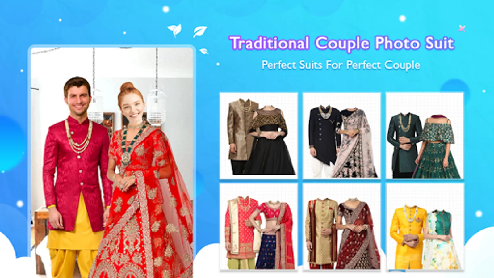 * Design your photos and surprise your beloved and set couple goals for everyone else using this. Traditional Couple Suit : Wedding Suit Editor is a superb application through which you can try on different bridal dresses and groom dresses along with awesome backgrounds, stickers and effects.