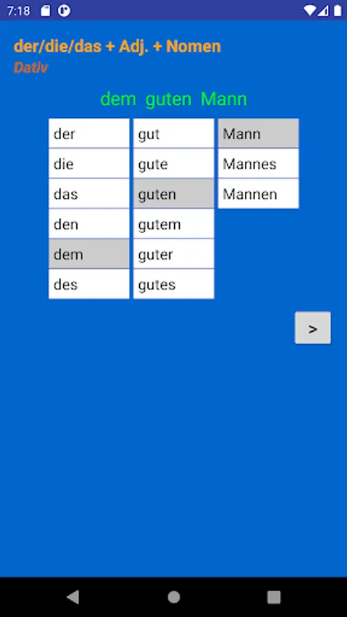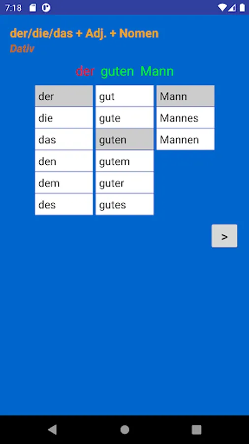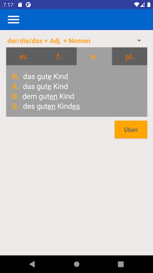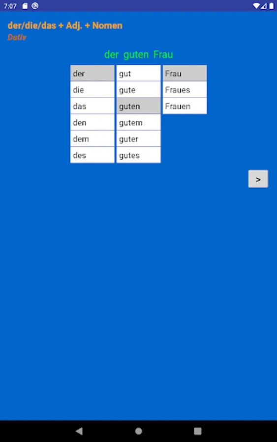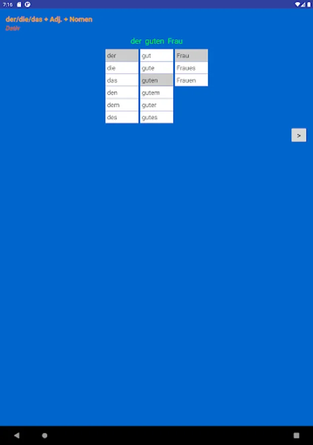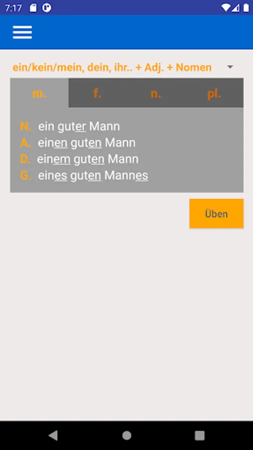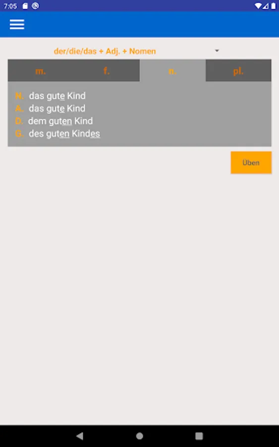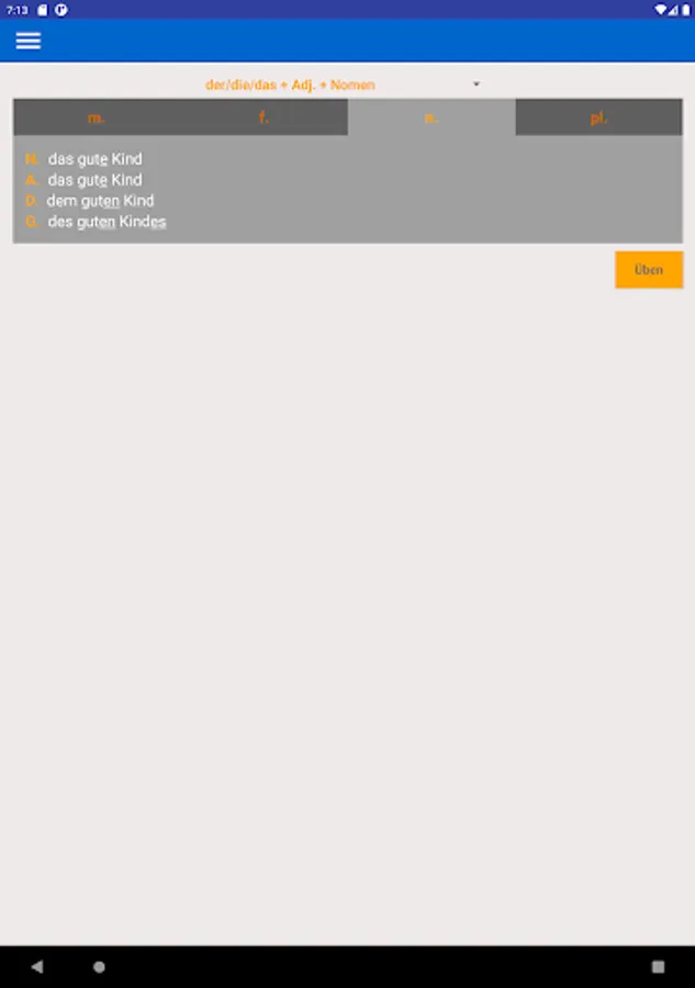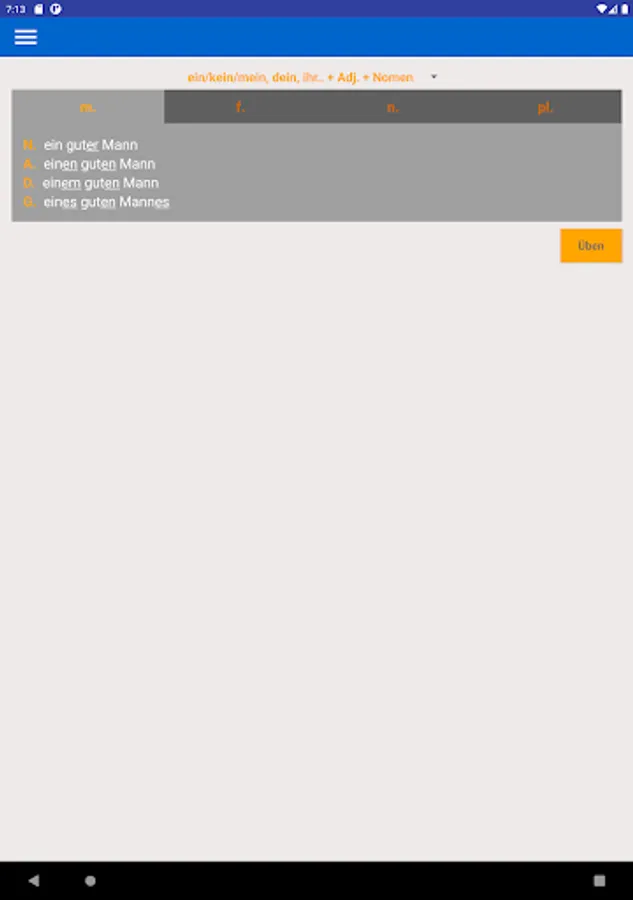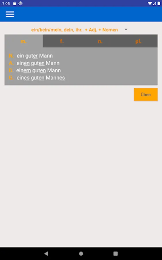 Using this app you can learn and practice all forms of adjective endings in German language.