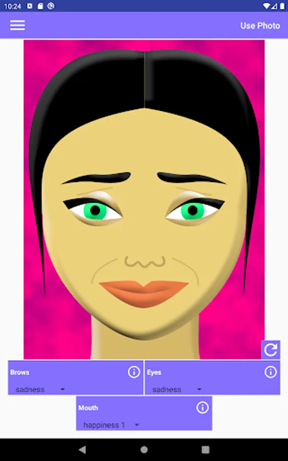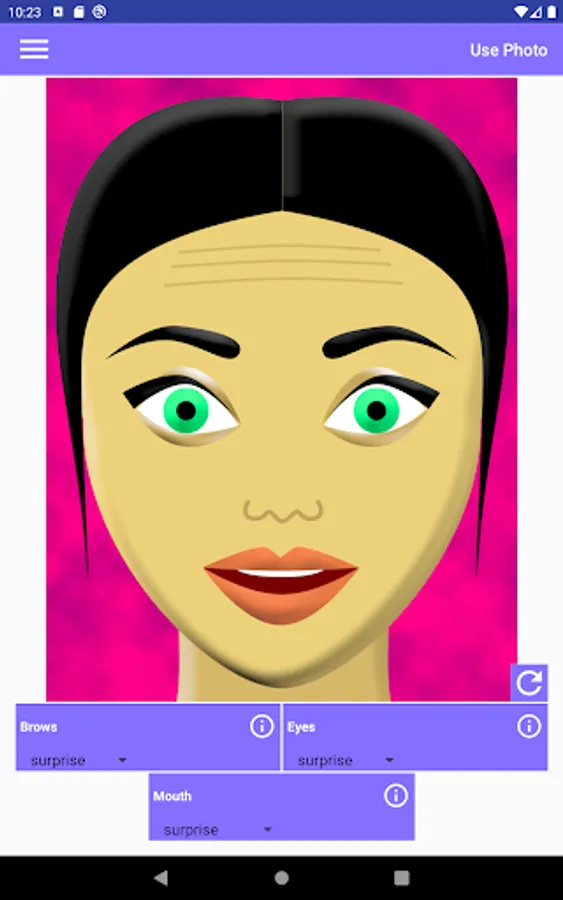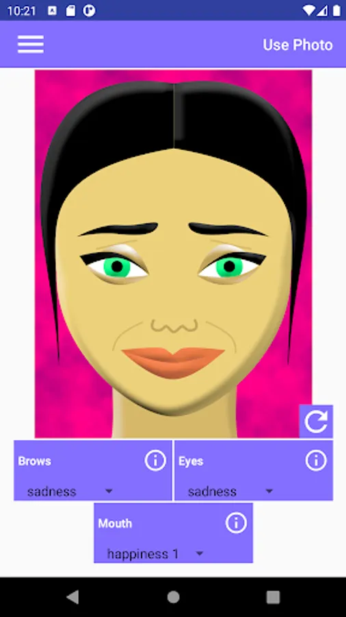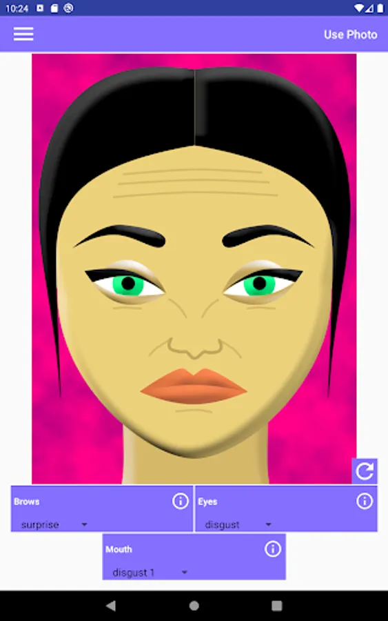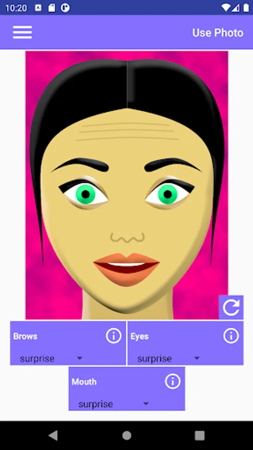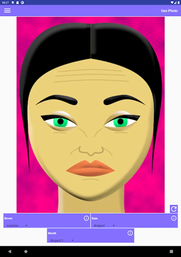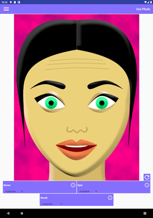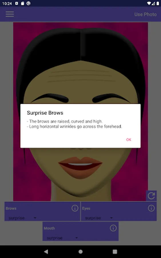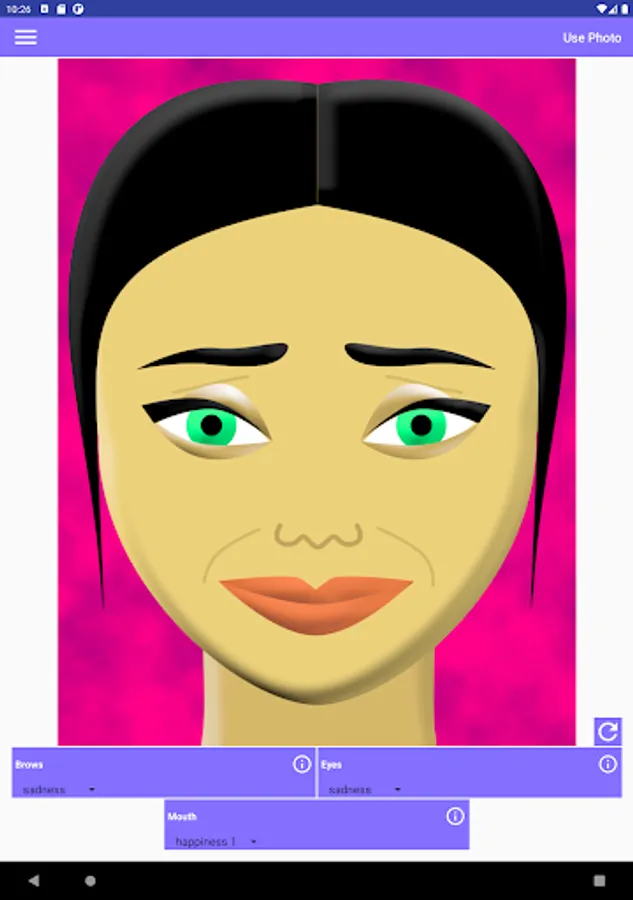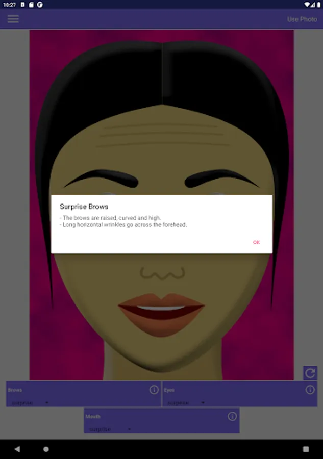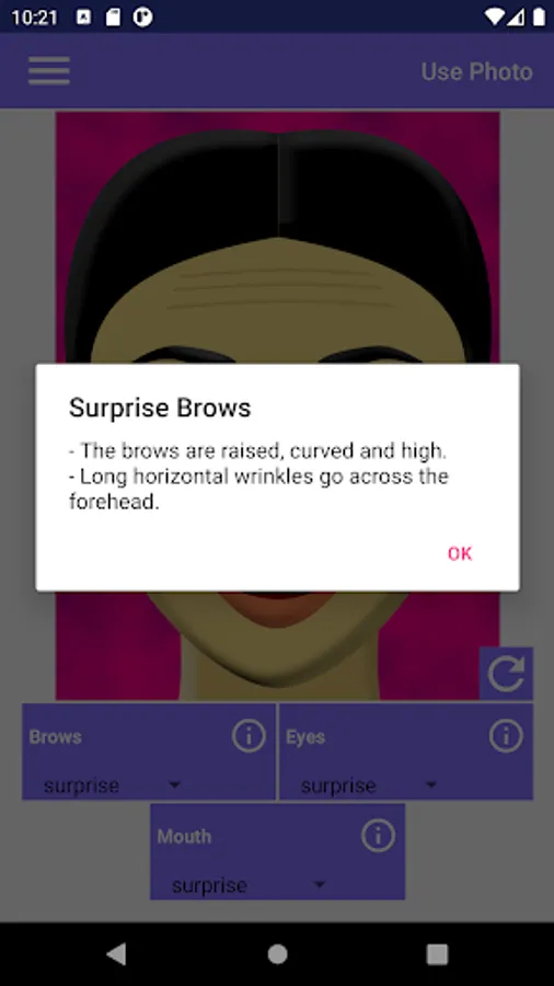 This app allows you to make various combinations of facial expressions. It helps in understanding people's emotions like surprise, fear, disgust, contempt, anger, happiness, or sadness. Each emotion affects the appearance of the brows, the eyes, and the mouth in the face. In order to know what happens exactly to each part of the face, tap the corresponding info button.