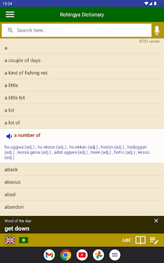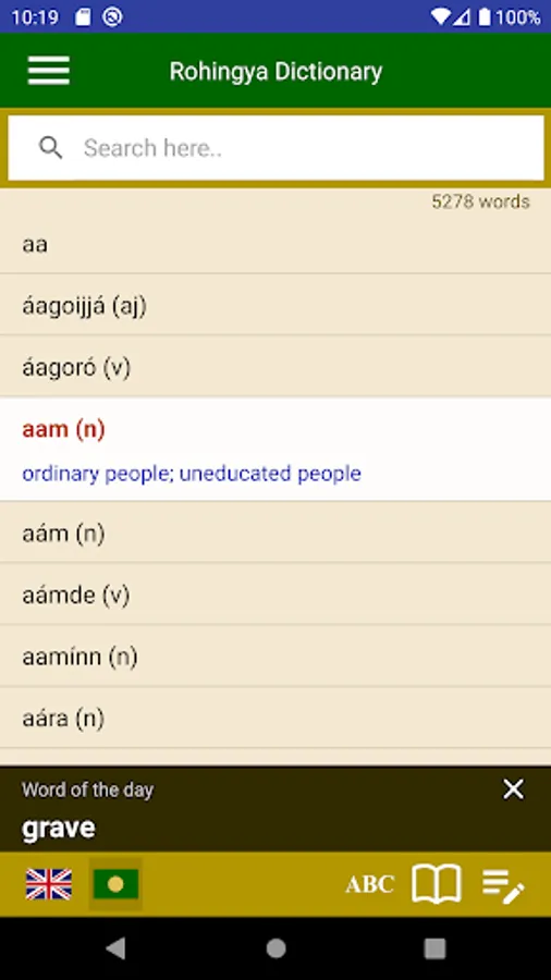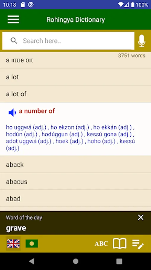 This is the first dictionary app for Rohingya-to-English and English-to-Rohingya translation based on the Rohingyalish writing system. The words are listed in an alphabetic order. You can browse or quickly search a word in the list, then tap the desired word to see its translation.