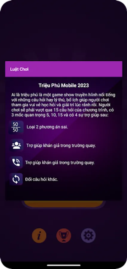 Who is a millionaire 2023 is a famous TV game show with interesting and useful questions to help players participate in fun learning and entertainment in their spare time. Players will have to pass 15 questions of the chapter. process, there are 3 milestones 5, 10, 15 and there are 4 supports.