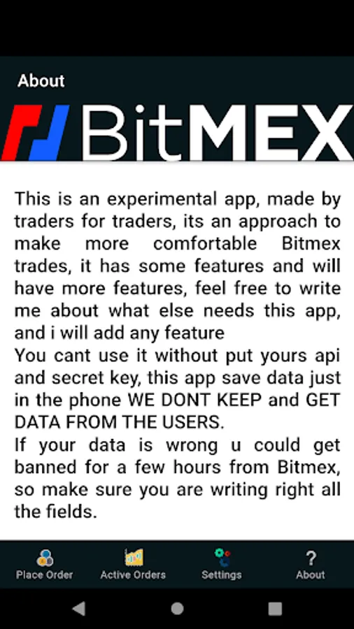 This is an experimental app, made by traders for traders, its an approach to make more comfortable Bitmex trades, it has some features and will have more features, feel free to write me about what else needs this app, and i will add any feature