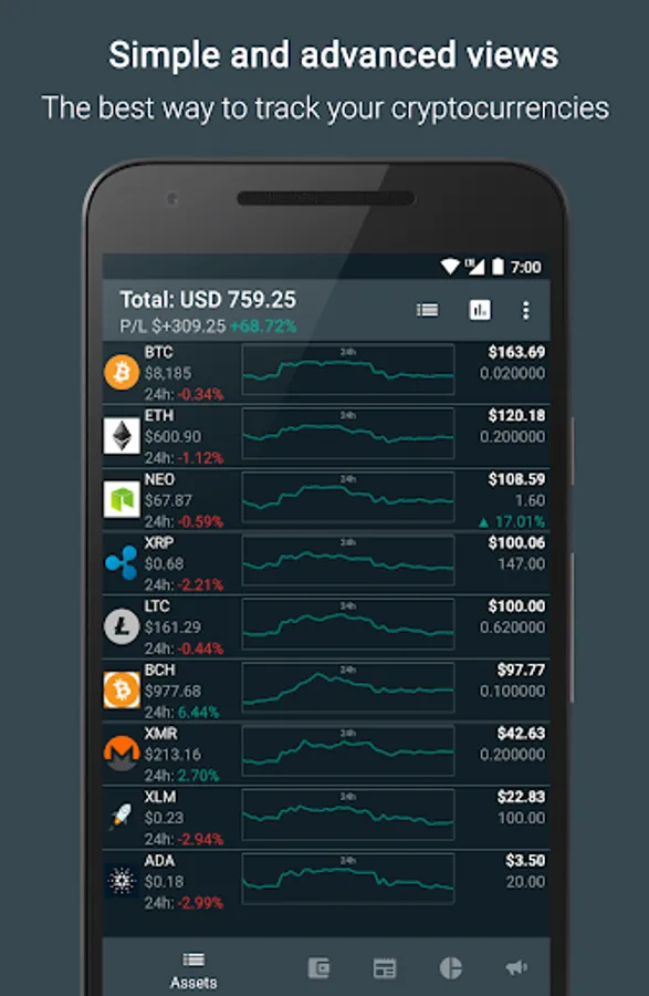 ✔BASIC & FULL PORTFOLIO CHARTS: Get a clear audit of your entire investment portfolio, good-looking charts, always know what's your profits/losses. You can choose between a faster and more basic overview of your crypto portfolio or a more detailed list of coins. You can also see how your portfolio is distributed using advanced pie and bar charts.