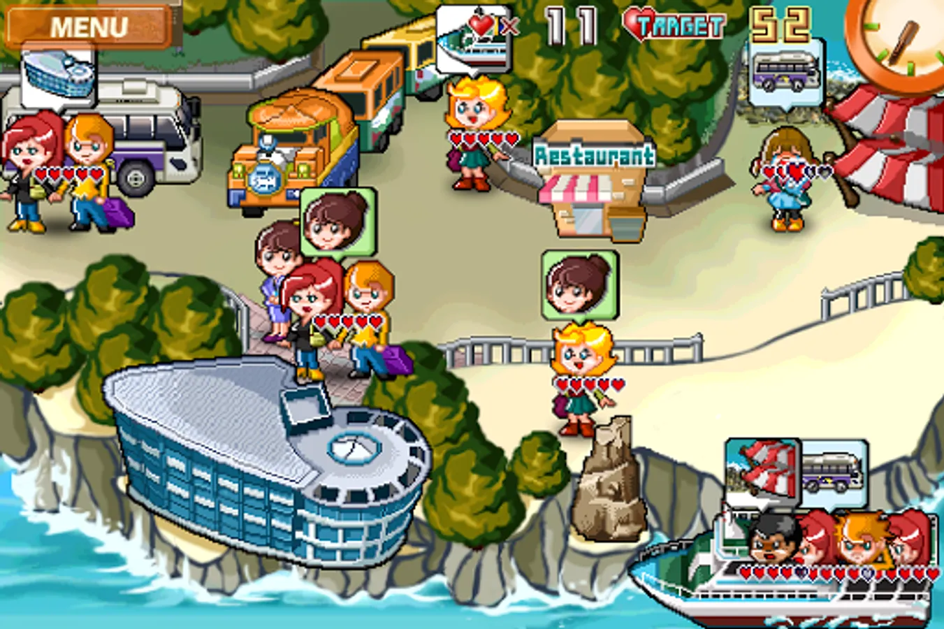 - To complete a level, reach the target hearts total before the day is over.