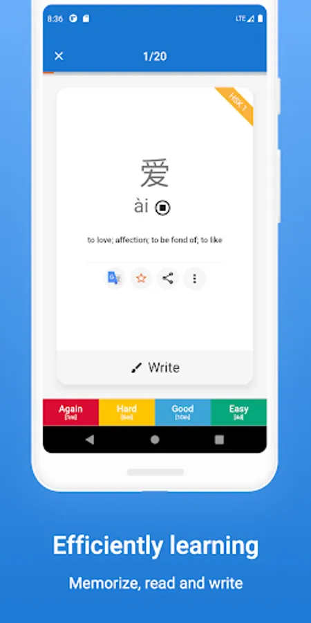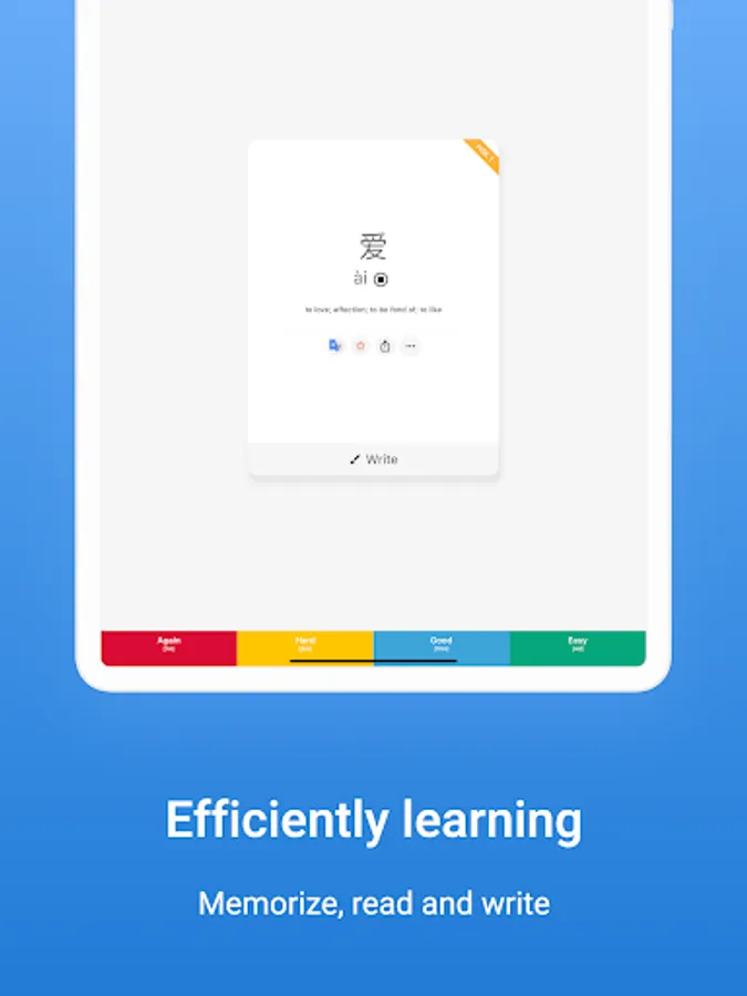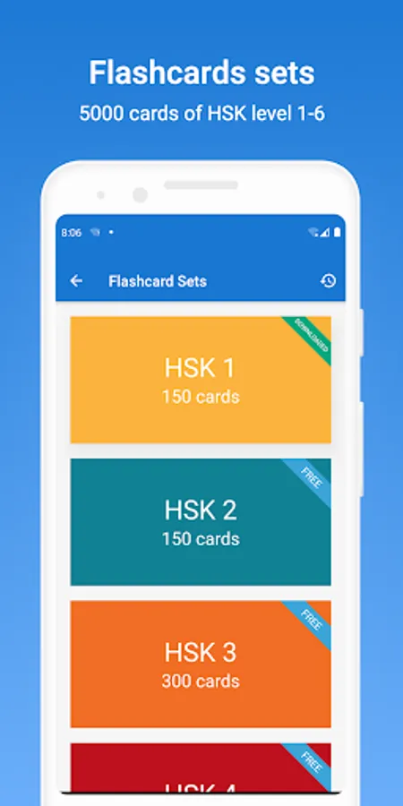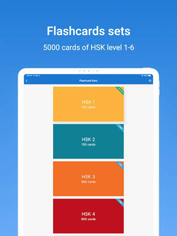 The app contains all 5000 vocabulary cards of the latest HSK(Hànyǔ shuǐpíng kǎoshì, 汉语水平考试) 1-6, which can help you memorize, read and write Chinese vocabulary easily and efficiently, and all for free.