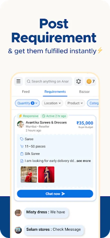 Search for your buyers and connect with them on Anar. Can’t find some of your buyers? Invite them on Anar so that they can see your updates daily and also get buyers business requirements like in IndiaMart, TradeIndia, JustDial, JDMart, WhatsApp Business, Udaan & Meesho.