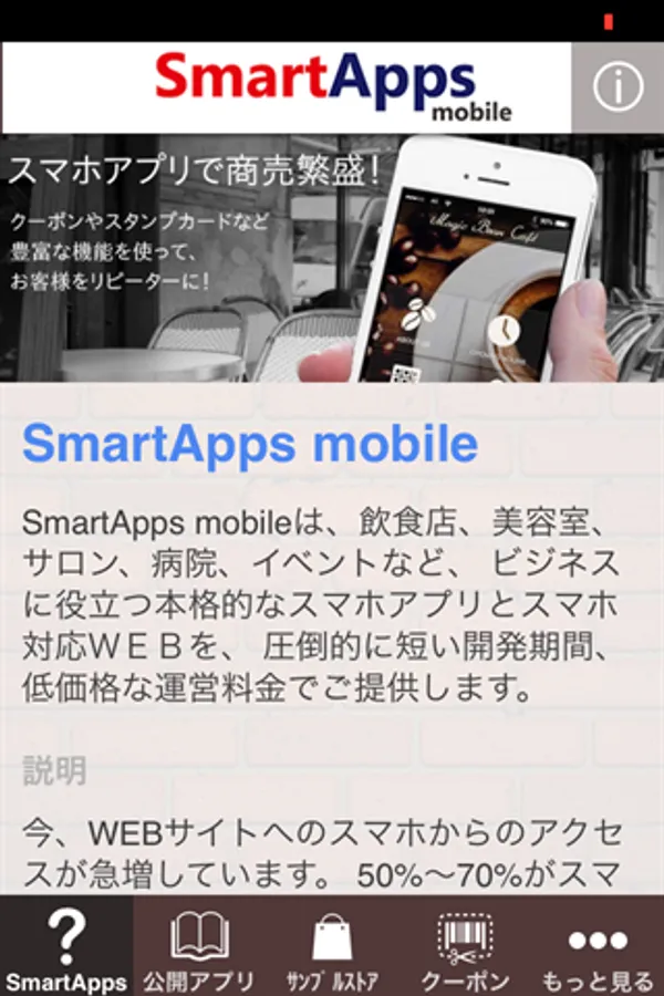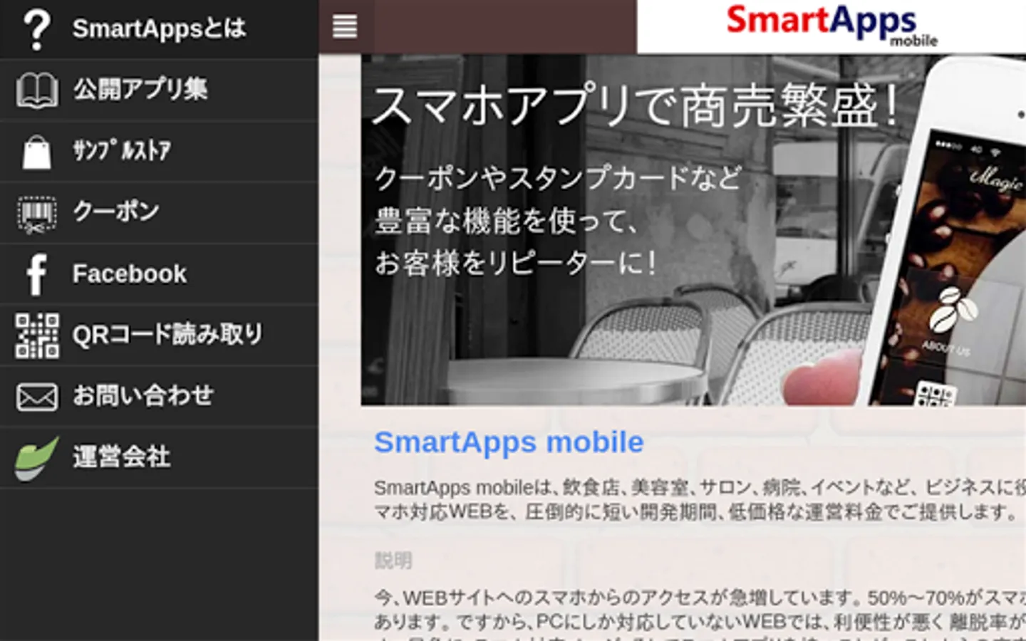 SmartApps mobileは、飲食店、美容室、サロン、病院、イベントなど、ビジネスに役立つ本格的なスマホアプリとスマホ対応WEBを、圧倒的に短い開発期間、低価格な運営料金でご提供します。