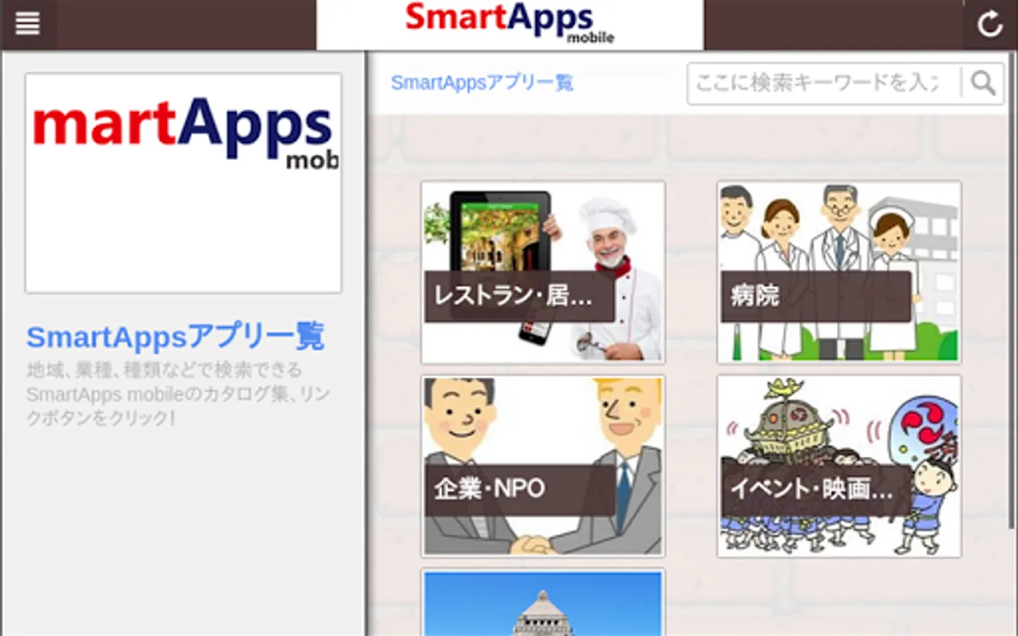 当アプリでは、SmartApps mobileで実際に制作・公開したアプリをカテゴリ別に登録しています。