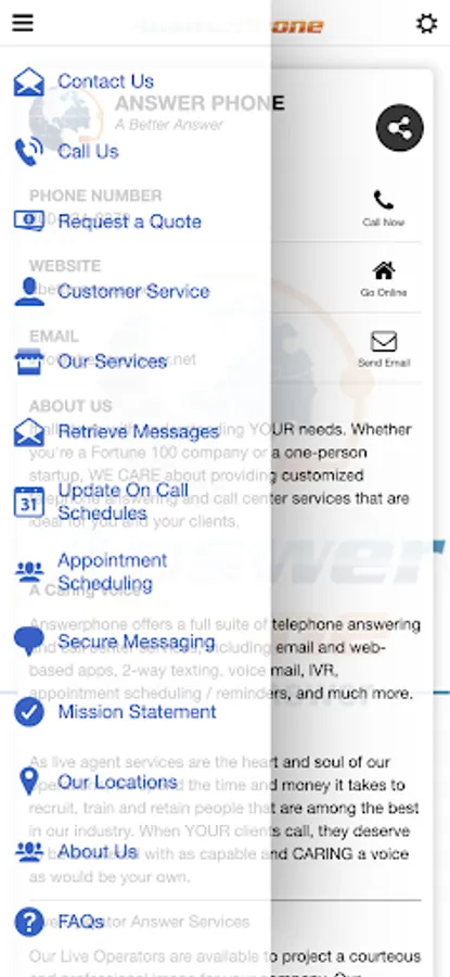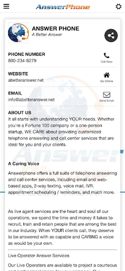 Answerphone offers a full suite of telephone answering and call center services, including email and web-based apps, 2-way texting, voice mail, IVR, appointment scheduling / reminders, and much more.