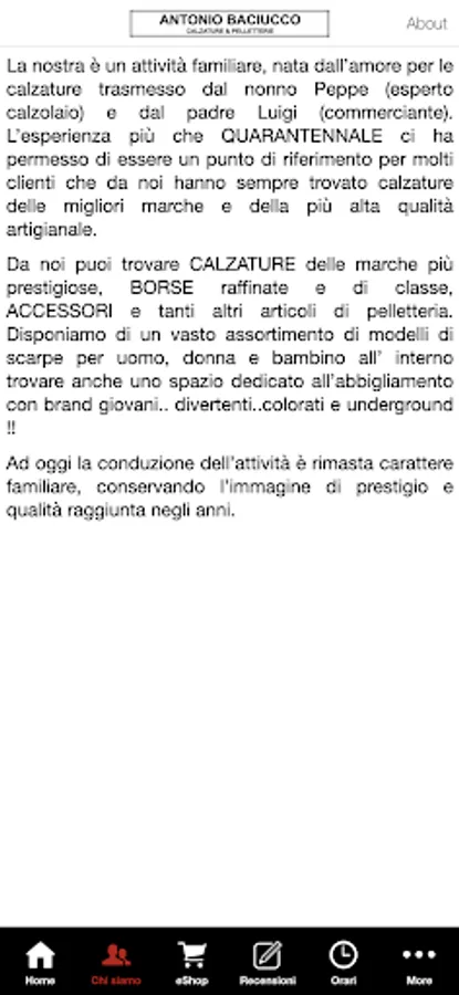 In applying Baciucco Footwear you will find the description of our store, with the brands, an extensive photo gallery, user reviews and the ability to buy online. Follow news and events and take advantage of coupons and special offers. To contact us you just need one click!