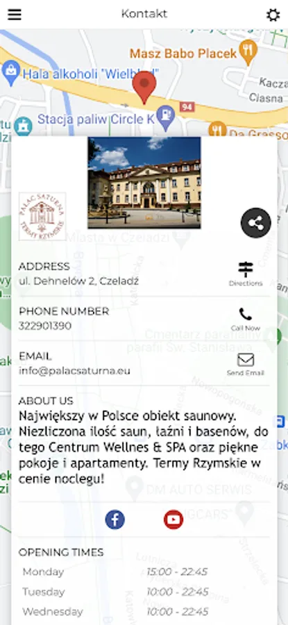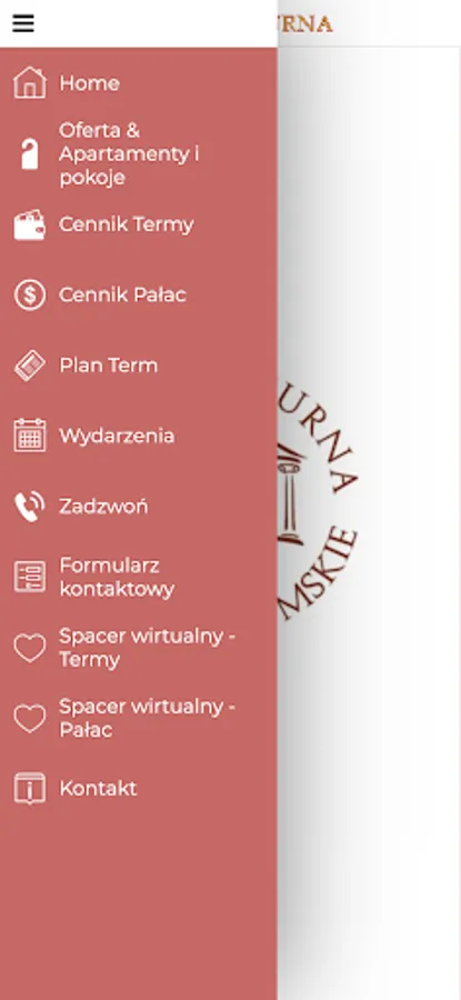 Map, Offer, Apartments and rooms, Thermal Price List, Palace Price List, Thermal Plan, Events, Call, Contact form, Gallery, Video, Facebook, Promotions, Stamps, Contact