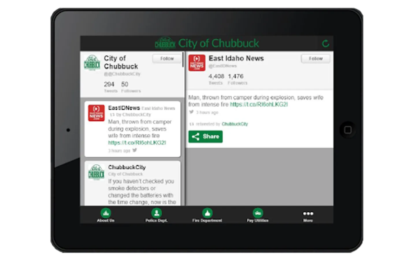 This is the official mobile app of the City of Chubbuck, Idaho. In this app you will find useful information about the City of Chubbuck, it's Police and Fire Departments, and more. Pay your utilities, submit a report, find out where Chubbuck Schools are located, as well as other City offices and buildings. Get up to date and current news alerts and happenings for the City of Chubbuck.