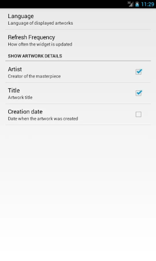 Widget is resizable, so that you can choose the size that suits your needs. This program can show information about artworks in Catalan, English, French, German, Italian, Polish, Russian, Spanish and Ukrainian.