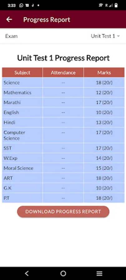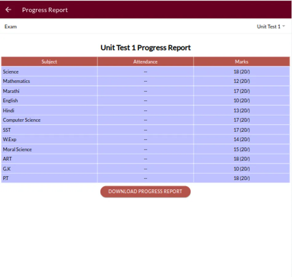 Progress Report – Display the marks details and download the progress report in pdf format.
