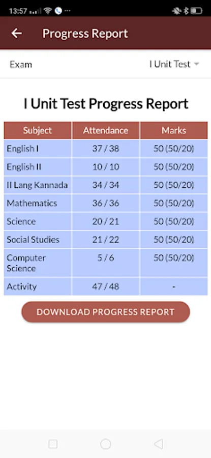 Progress Report – Display the marks details and download the progress report pdf format.