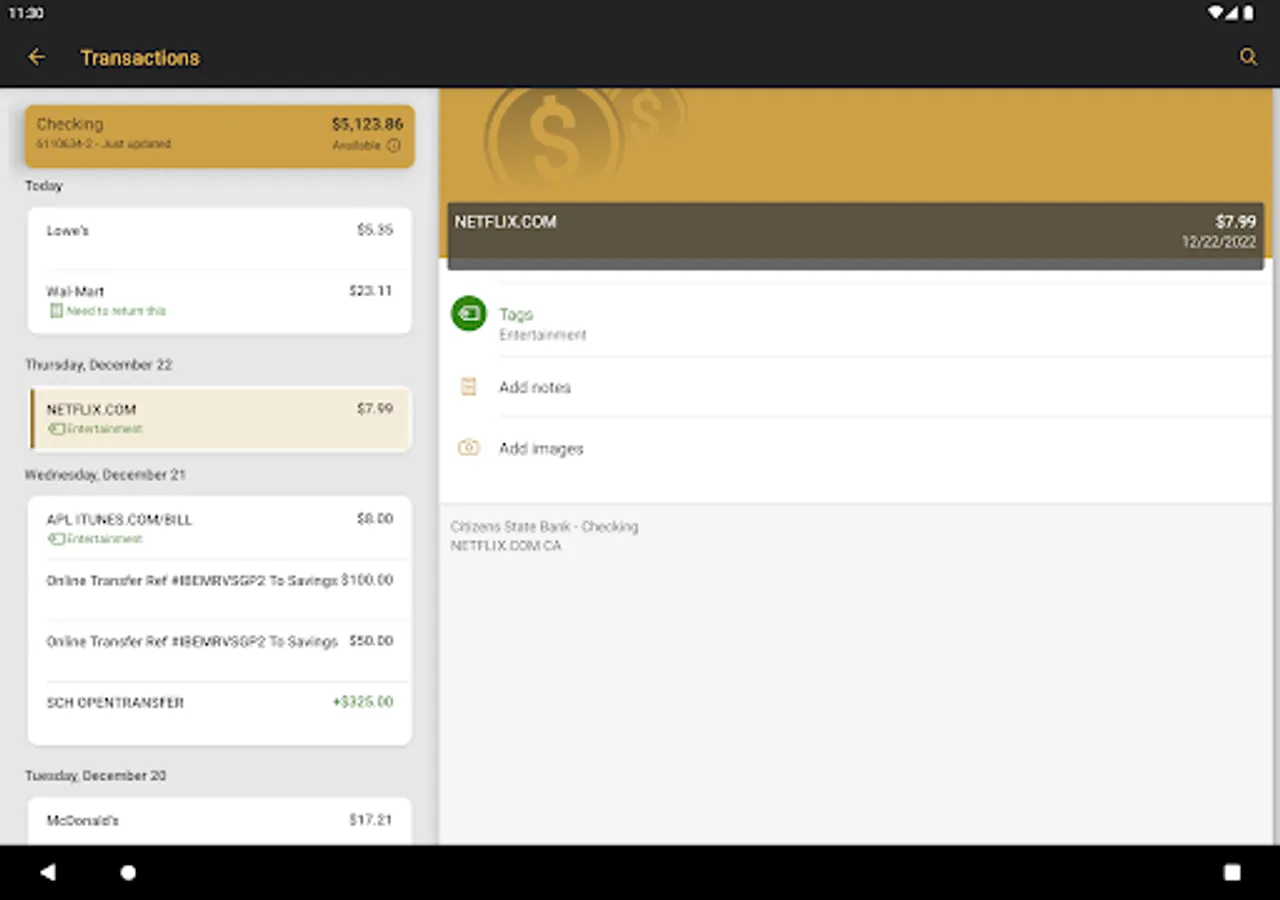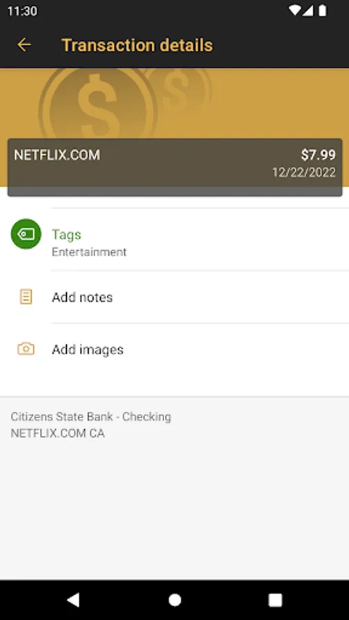• Keep your transactions organized by allowing you to add tags, notes and photos of receipts and checks.