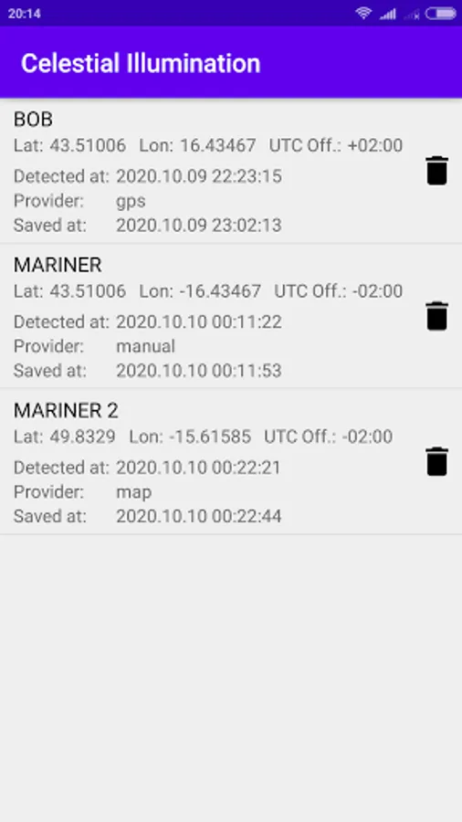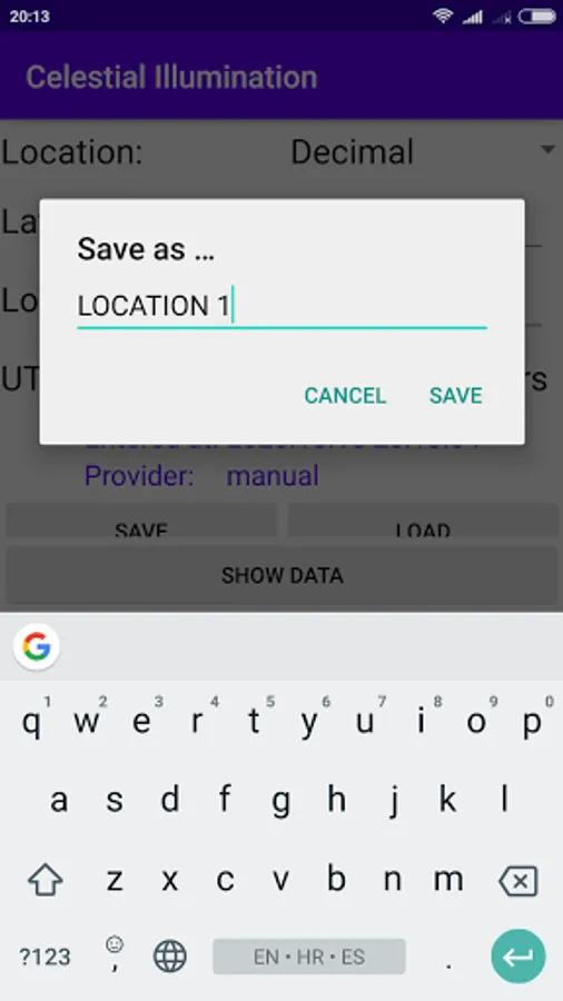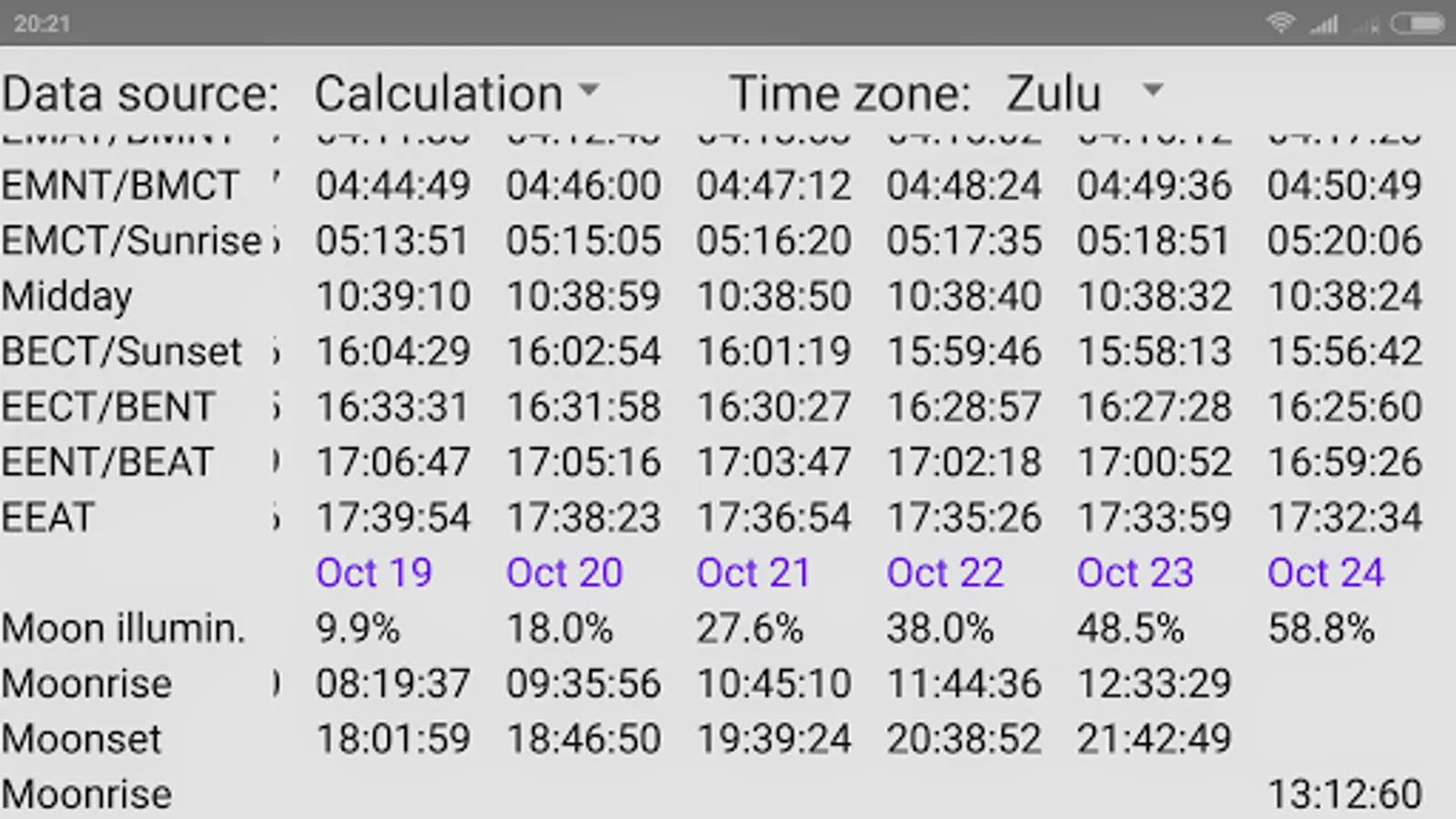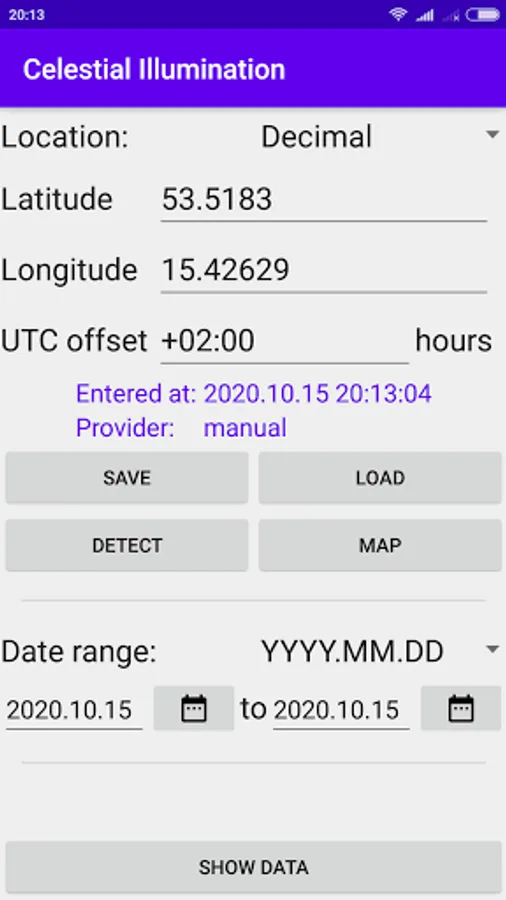 App shows illumination data based on location (detected by device or entered by user) and time. The illumination data is available for a single date or for a range of dates.