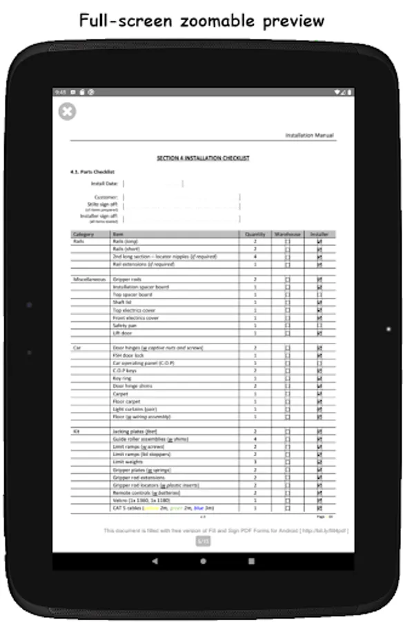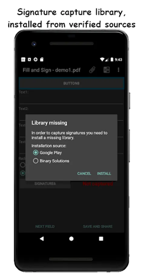 For signing capabilities you will be prompted for additional library installation, once needed. Less than %5 of Fill and Sign PDF Forms app users need Signature Capture library, and that is one of the reasons why it is distributed separately. Installation is either from the Google Play Store or directly from our server, so it is completely safe.