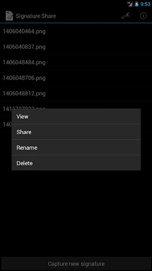 Press and hold for context menu ('View', 'Share', 'Rename', 'Delete').