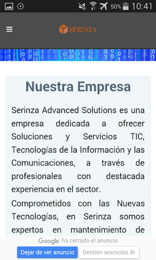 In this application you will find all the services offered Serinza Solutions S.L. well as other information about the company. With it will have access to the same content on the Web but in the palm of your hand.