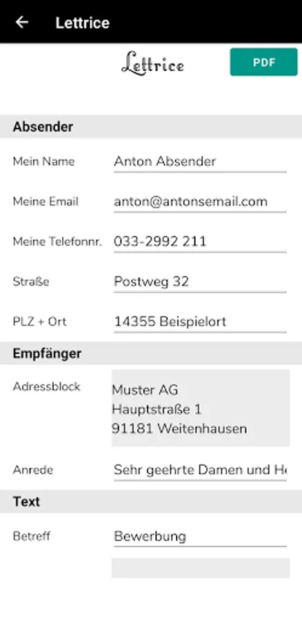 Lettrice features an easy-to-use input form without the hassle of a big office software. Just enter your text and click "Save" to produce a PDF which can be sent by email or printed directly from your phone or tablet.
