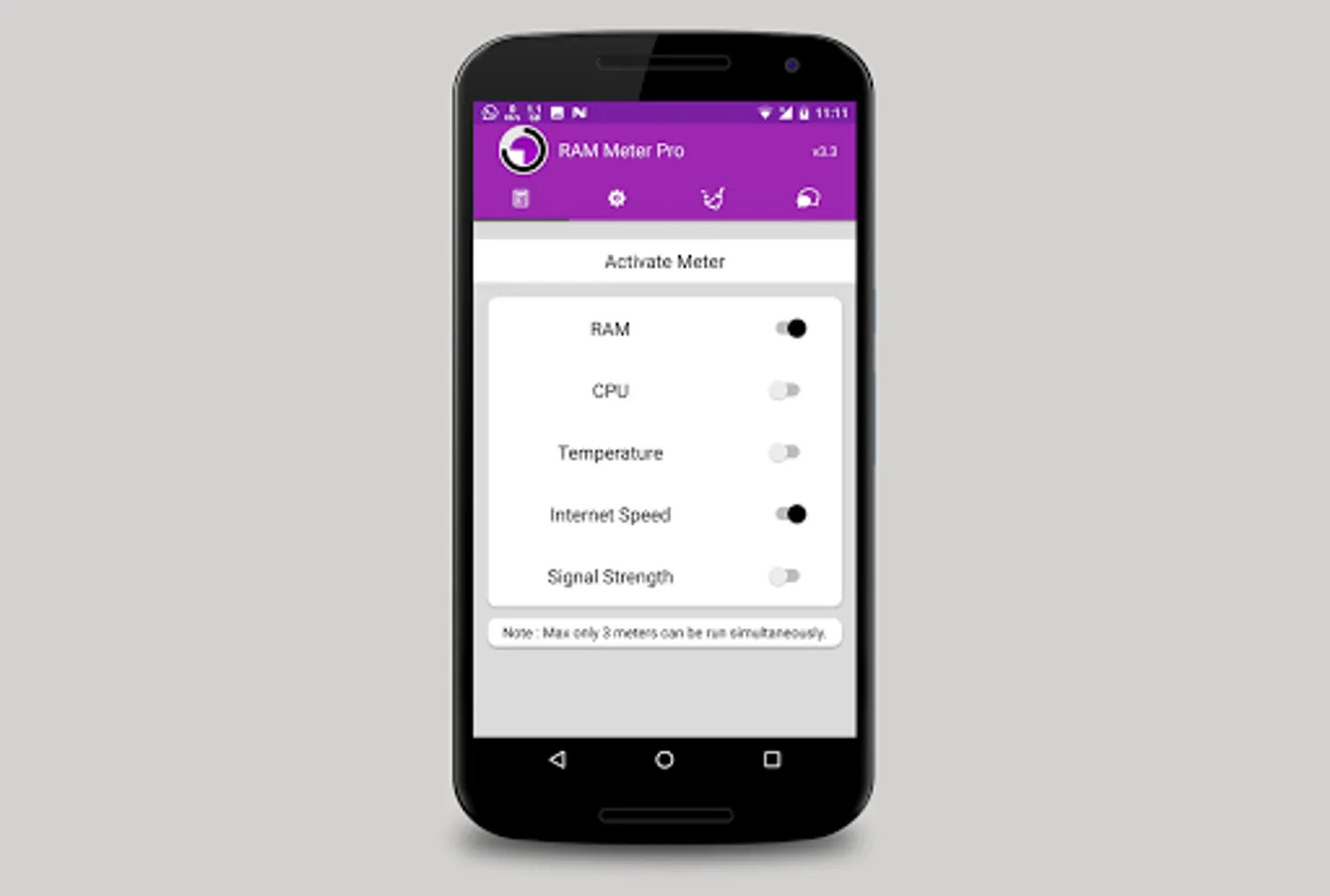 RAM Meter is tool as well a widget which provides many other feature similar to RAM meter such as Temperature Meter, CPU Meter, Internet Speed Meter and Signal Strength Meter all under same roof. The best part of the app is that all the features can be run simultaneously together in Android versions above Lollipop and has a limitation of accessing 3 Meters in Android versions lower than Lollipop. Another advantage of the app is that all the processes run in the background and does not consume as much RAM as other ordinary foreground apps. Hope you all enjoy the app.