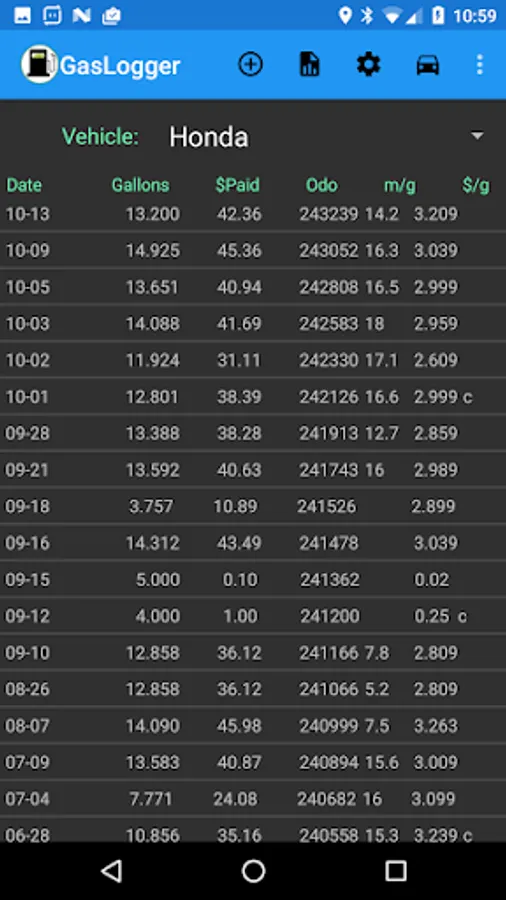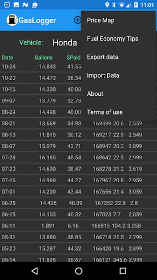 GasLogger is a simple app to log your gas fillups for all your vehicles and see some statistics, like your mileage from fillup to fillup (mpg).