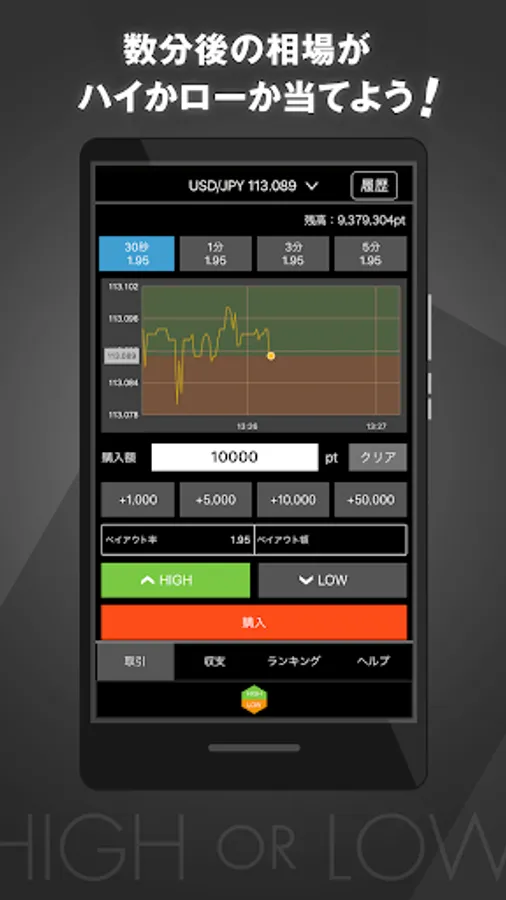 If you expect the price to be higher than 110 yen in 1 minute, place a high point bet, and if you expect the price to be lower than 110 yen in 1 minute, place a low point bet.