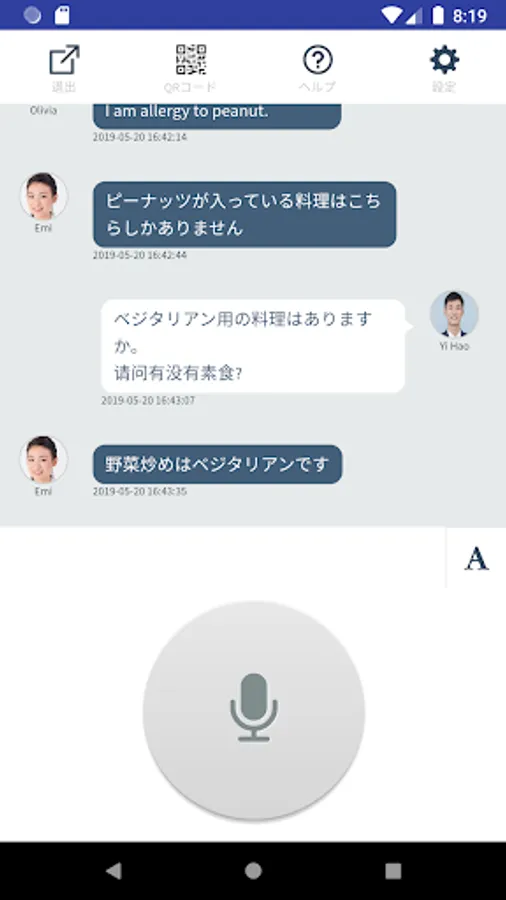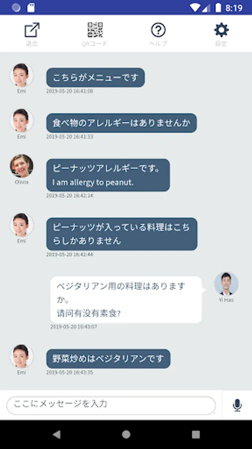 (1)本アプリでログイン後、ルームを作成します。会話する相手は、ルームのQRコードを読み取るだけで、同じルームに参加できます。(会話する相手はアプリのインストール・ログイン不要で、ブラウザからすぐに利用できます。)