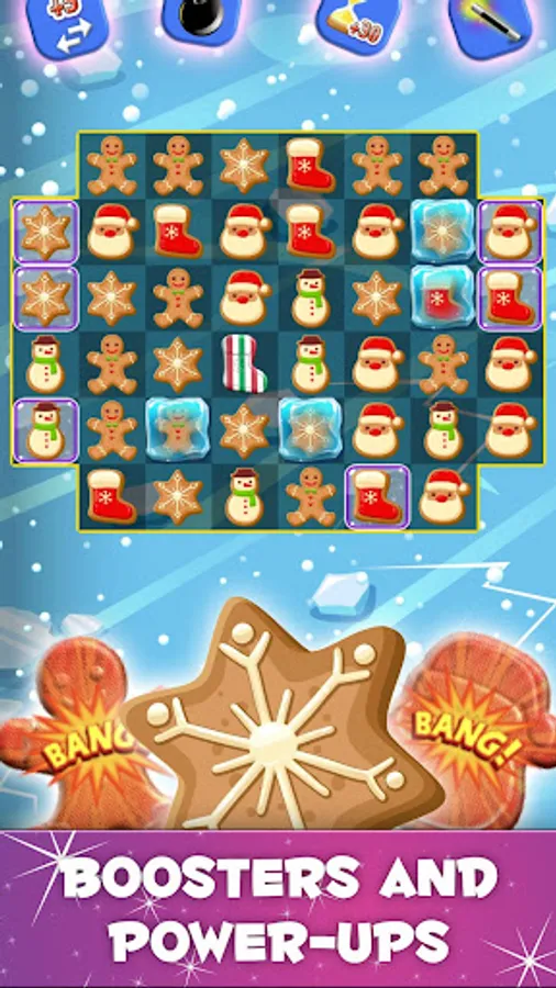 Match Christmas cookies to clear them, earning points & completing challenges as you progress through the Cookie Land map! Earn special power-ups & add optional in-game boosters to give your cookie destruction an extra "crunch"!