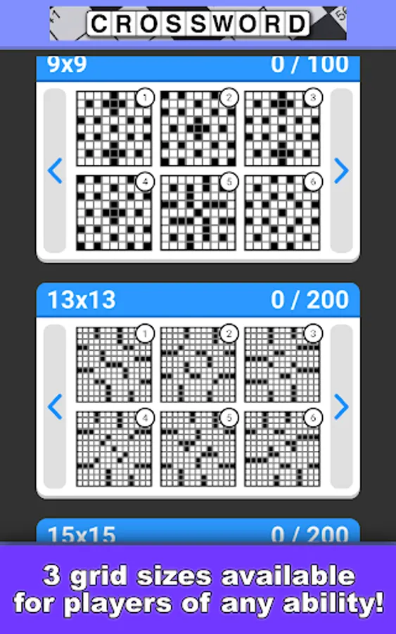 3 grid sizes of 9x9 (beginner), 13x13 (novice) and 15x15 (expert) are available, so whether you've never played a crossword or you play them all the time - you can be sure that this is the crossword app for you!