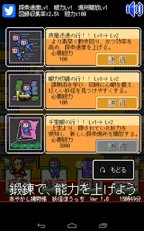 "Training": by consuming the "courage" obtained by defeating the monster, do the "training" to increase the capacity each. Or increase the frequency of rare monsters, such as opening a new search location, obtained effect in accordance with the levels.