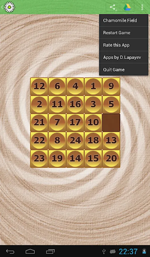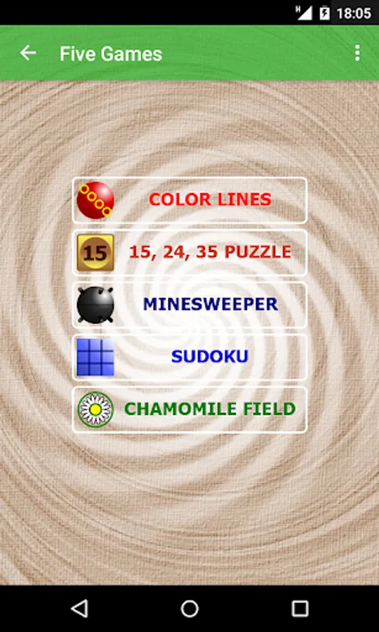 The application contains five games: "Color Lines", "15, 24, 35 Puzzle", "Minesweeper", "Sudoku" and "Сamomile Field". Game selection is performed when the application start or from the menu. Сlick on the outside the game field to menu access (for Android 3.0 and above). To display the best result of the game click on the counter or timer. This app does not contain advertising and not use a network connection.