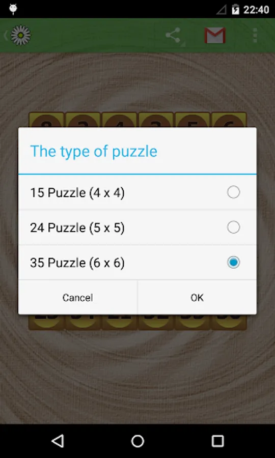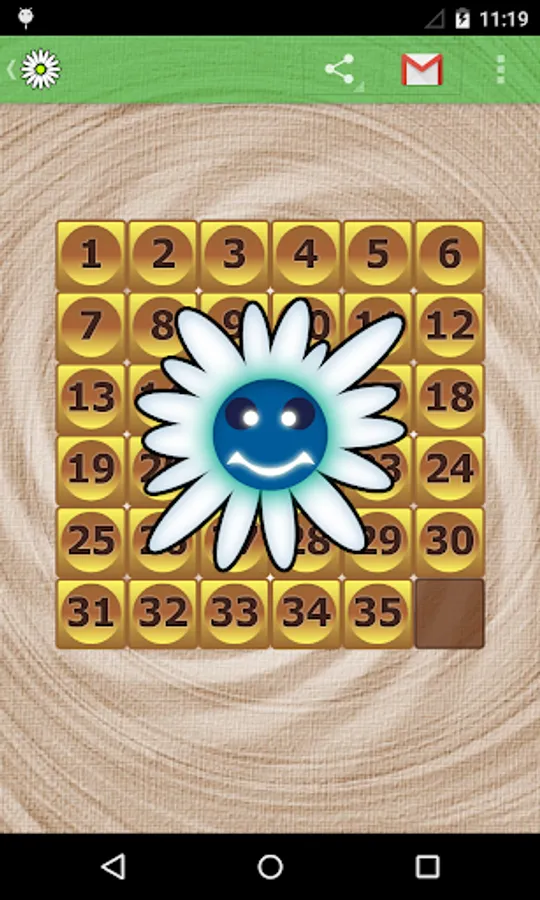 • The game "15, 24, 35 Puzzle" provides three kinds of playing field: 4x4, 5x5, 6x6. Change the type of puzzle you can when you start a new game (application menu). The game's goal — to set numbered tiles in ascending order, by moving them on the field.