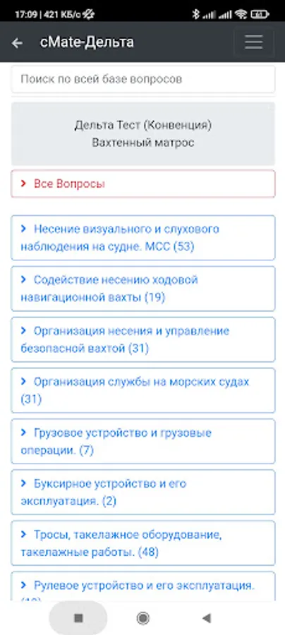 All questions are divided into categories (Safety measures and precautions when performing ship work, Maintaining visual and auditory surveillance on the ship. MSS, Facilitating the keeping of a navigational watch, Organization of keeping and managing a safety watch, Organization of service on ships, Cargo handling and cargo operations. , Towing gear and its operation., Cables, rigging equipment, rigging., Steering gear and its operation., Mooring and anchoring gear and their operation., Precautions and assistance in preventing pollution of the marine environment)