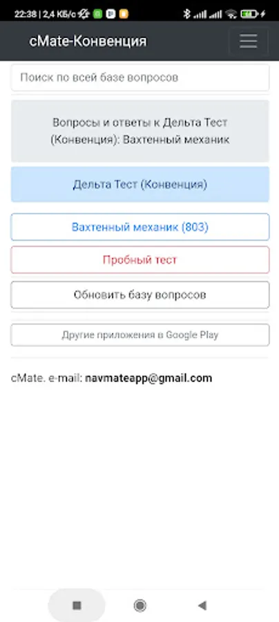The application contains a database of questions and answers to the new Convention plus test (delta test) with the ability to take a practice test that you can set up yourself.