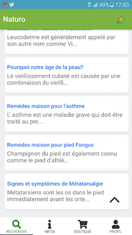 Naturo is a search engine to find: advice, prescriptions and treatments based on products that surround us, ie natural. It will help you find well being using natural products whether for a small headache or a viral infection.