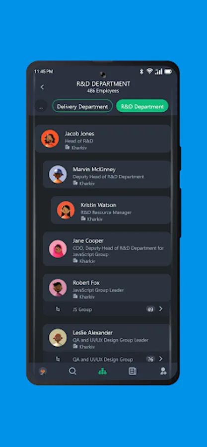 The Mobidev People mobile application helps to unite the MobiDev team for joint work. Always keep abreast of the company's life, without missing anything important. Know who to turn to for help with access to an up-to-date company structure. Be aware of colleagues' work schedules for better planning. Communicate within the community using the list and contact information of its members, as well as the advanced search function.