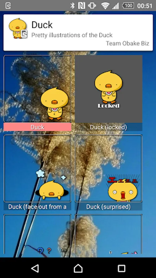 Duck is a collection of lock screen illustrations of a duckling by Japanese illustrator Chiffon. The duckling is yellow and wears a slobbering hood. The duckling is in various poses.