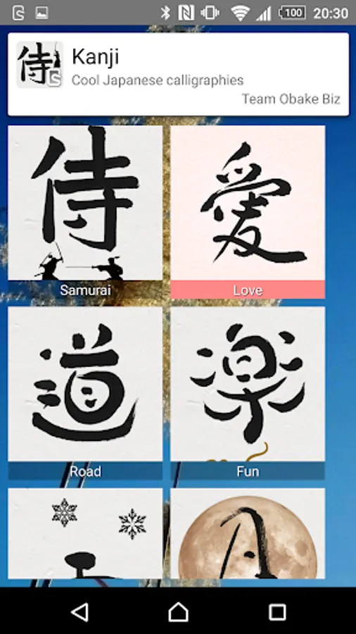 Kanji is a collection of lock screen designs featuring kanji characters drawn by Japanese Ayako. You can enjoy a variety of Kanji typefaces.