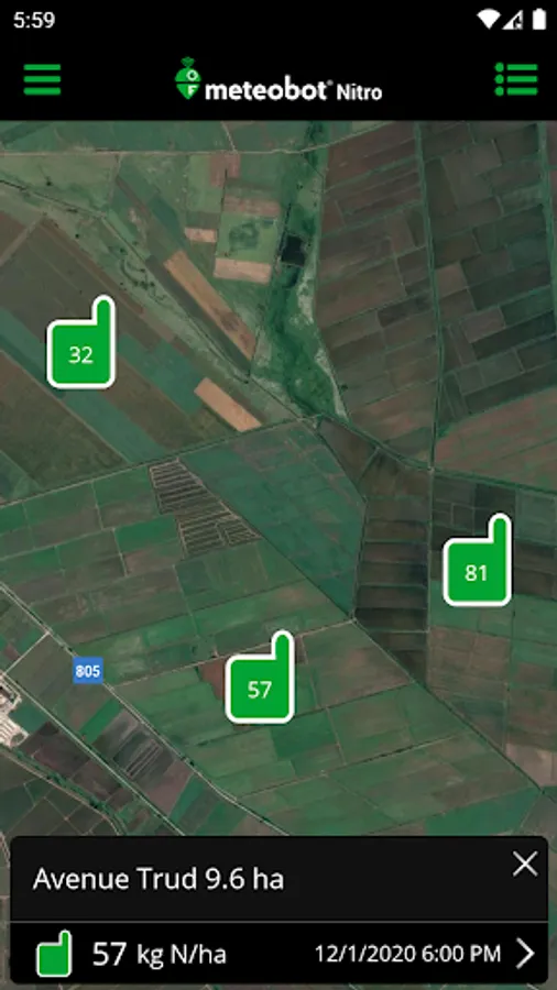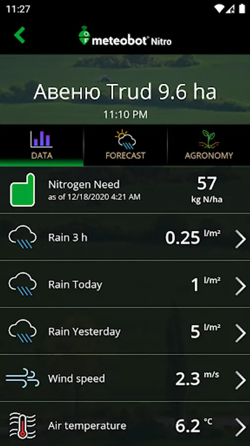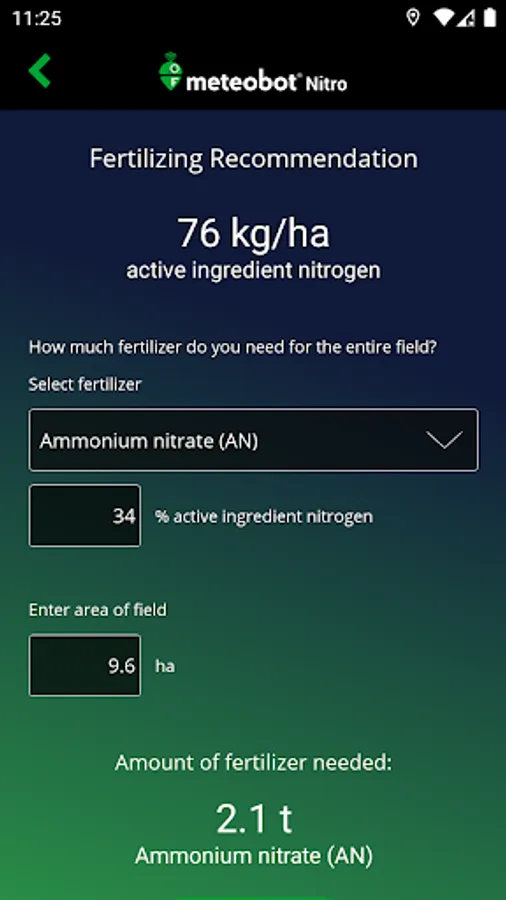 On the basis of chlorophyll content, rainfall, soil moisture, soil temperature, air temperature, soil type and content, weather forecast and wheat variety, you get a customized nitrogen fertilizer recommendation from the Meteobot® Nitro mobile app.