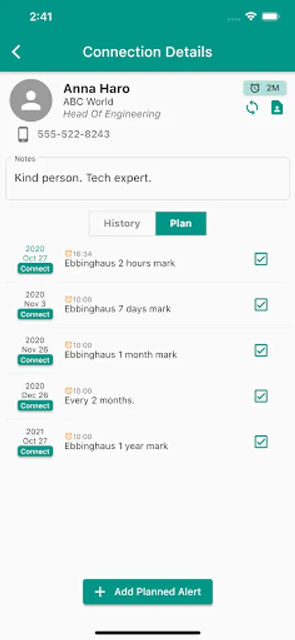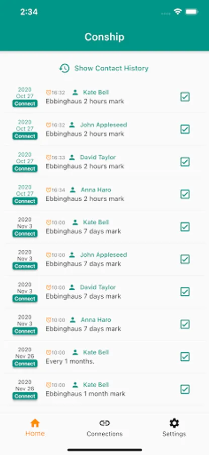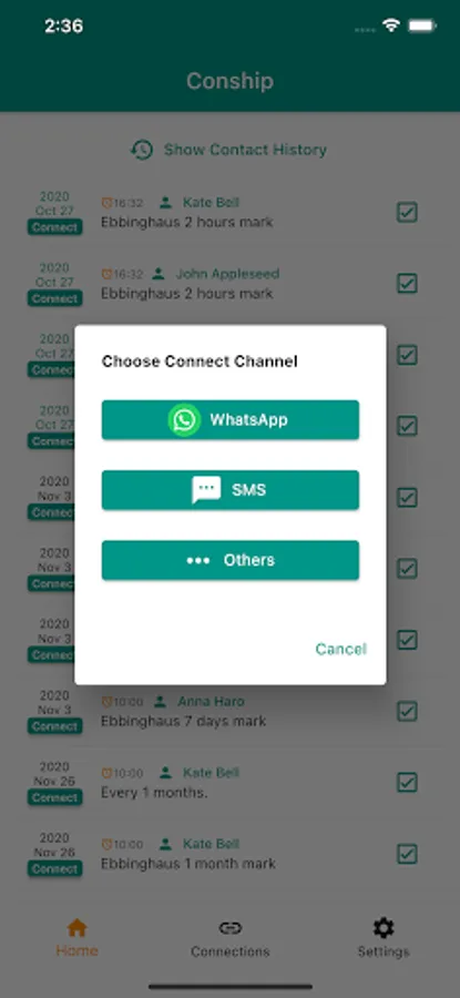 Conship creates alerts based on Ebbinghaus Forgetting Curve, as well as your chosen frequency.